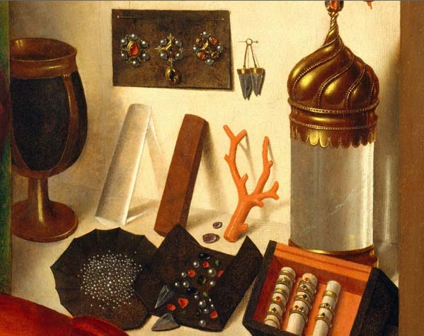 在上面的油畫作品中,我們可以從男客戶的帽子與金匠背后的首飾樣品展示上,看出首飾設計的主要類型。即環(huán)繞一個大的主石使用黃金來做鑲嵌。雖然寶石資源豐富,但是當時人們更加認為彩色寶石是黃金的裝飾品與象征財富能力的體現(xiàn)。