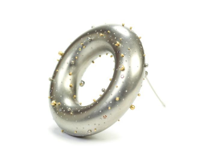 作品整體以完美的幾何形態呈現,弧面金屬的光澤創造出一種透明空間的錯覺,表面點綴的金銀粒與寶石則象征著遠處的星塵。這種像甜甜圈一樣的造型吻合近年來科學家們對宇宙形狀的推測(這個形狀在?sa Christensson的作品中也多次出現。)