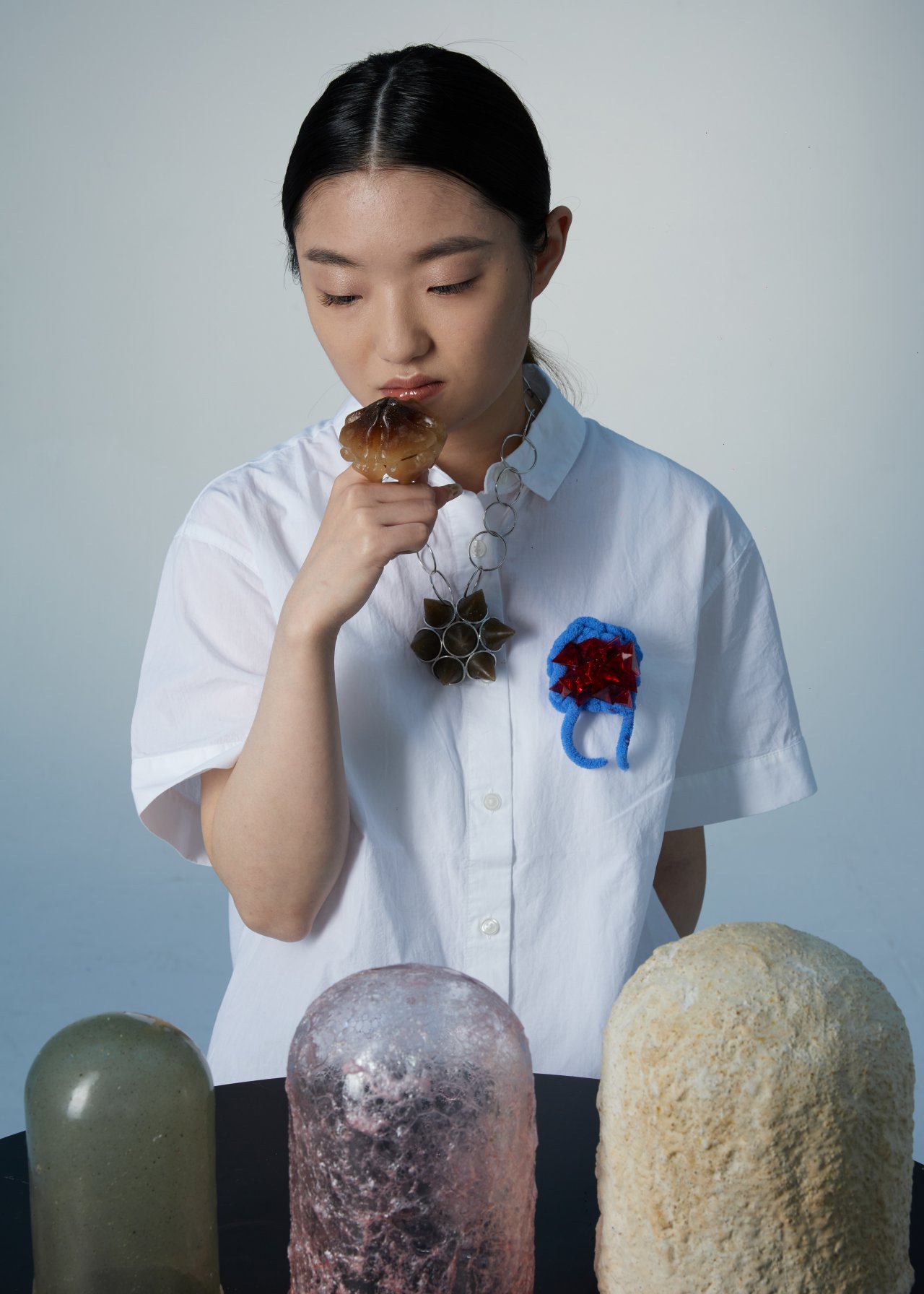 I employ innovative materials and fuse them with jewellery techniques for artistic expression. To depict my grandfather's rough texture, I grind the braised meat seasoning into powder, mix it with plaster powder, and let it dry to achieve a coarse texture. For my grandmother's dry and rough texture, I melt gelatin sheets, blend them with gelatin water and soapy water, and blow bubbles. When these bubbles dry, they mimic the roughness of my grandmother's hands. As