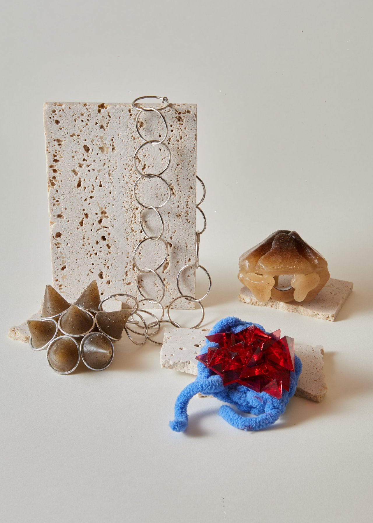 我運用新型材料結合首飾語言進行表達。為了制作爺爺粗糙的肌理,我將鹵肉料磨成粉末,與石膏粉混合并風干,營造出粗糙的質感。奶奶又干又糙的肌理則是通過融化吉利丁片,混合啫喱水和肥皂水制作泡泡,并在泡泡風干后觸摸起來呈現奶奶干糙的雙手感覺。至于我的肌理,我使用甘草粉混合硅膠,賦予作品柔韌和光滑的質感。我從這三種主要材料中提取各自的色彩板:我是清新的綠色,奶奶是憤怒的紅色和冷靜的藍色,爺爺是溫暖沉穩的黃棕色。接著,根據每個人的性格特點,我選取了相應的形狀:我是圓錐形,象征著對陌生人的警惕;奶奶是三角形,代表她口是心非的個性;爺爺則是梯形,象征他為人正直。通過結合這些顏色、肌理和形狀,我創作出了最終的成品。