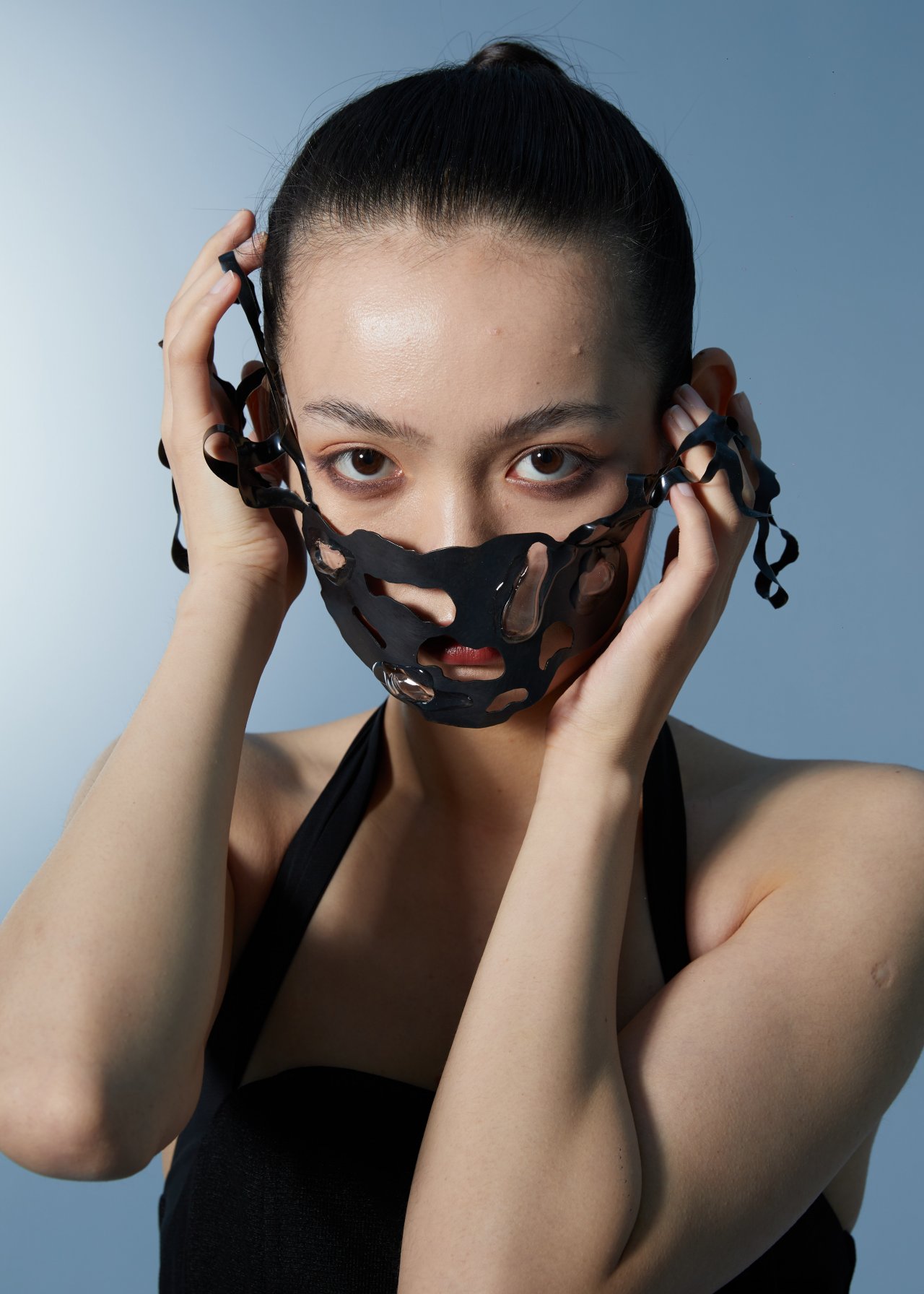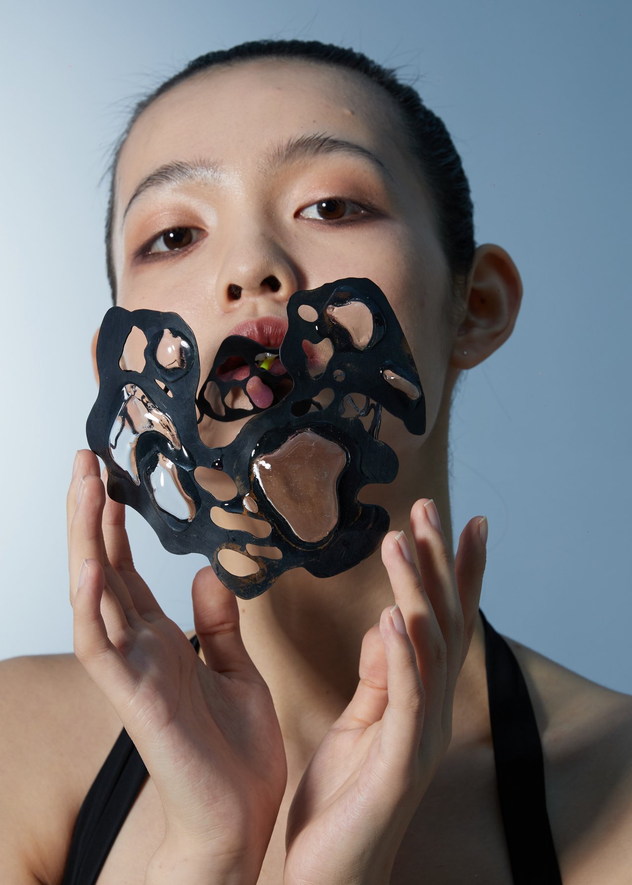 在作品《窒息感》中,以海牛因為海藻的泛濫而缺氧為靈感,我嘗試加入了有關海藻本身的材料去融入作品,比如海藻酸鈉。作品都是圍繞著面部去展開。因為環境和海洋的污染本質上人為因素占比更多,所以我想讓佩戴者感同身受海牛的處境。作品利用泡泡膠這一材料,結合封固在人面部的網狀框架,讓人們從視覺感受到想呼吸卻被外面的框架給阻擋住的痛苦。將金屬氧化成黑色,既想從視覺上讓佩戴者感受到缺氧帶來的痛苦,并且能突出海洋生物在海洋中的絕望。