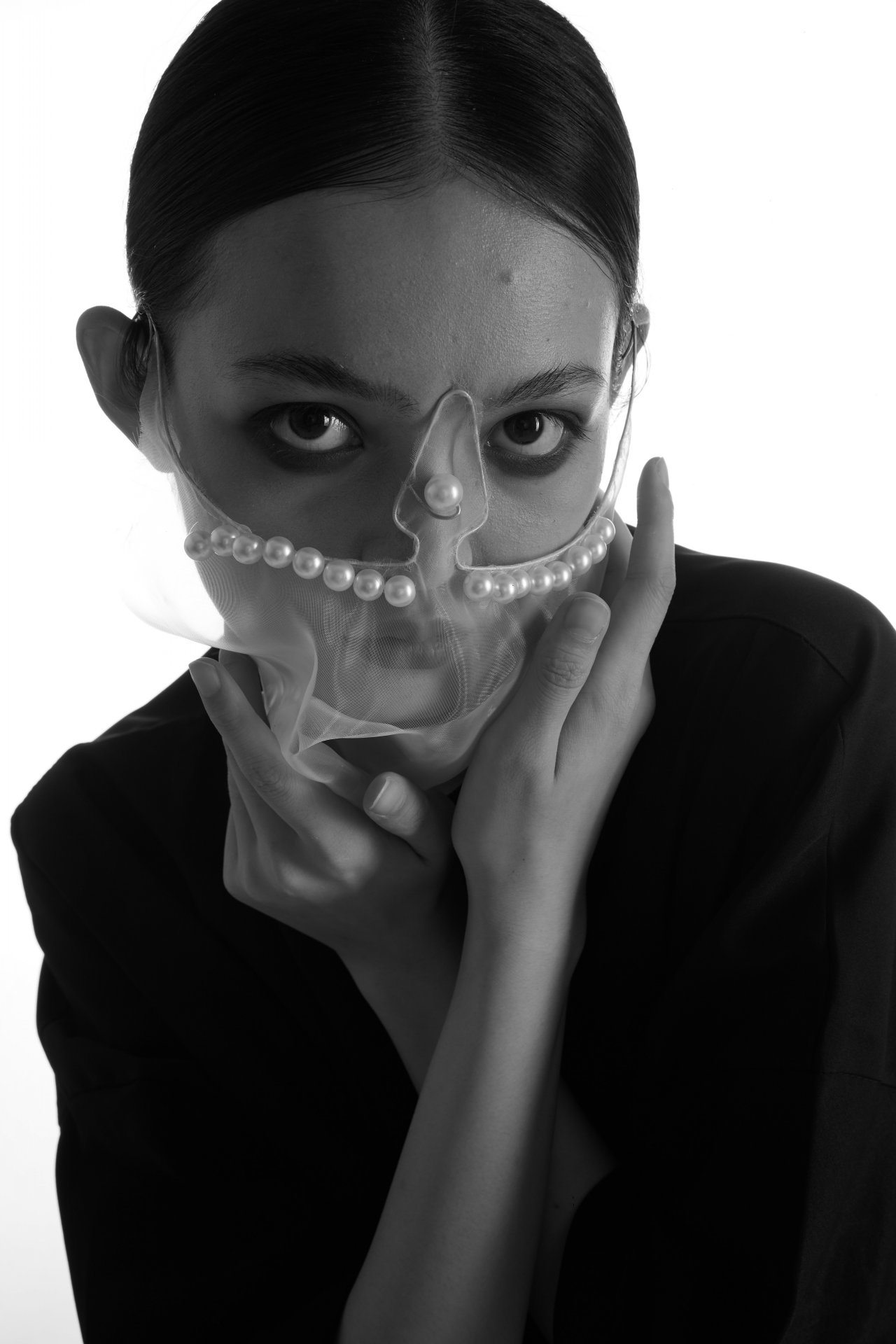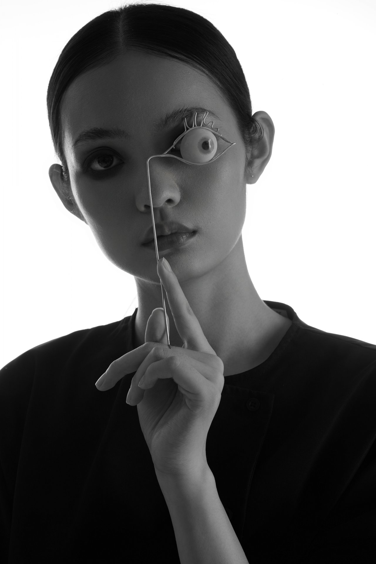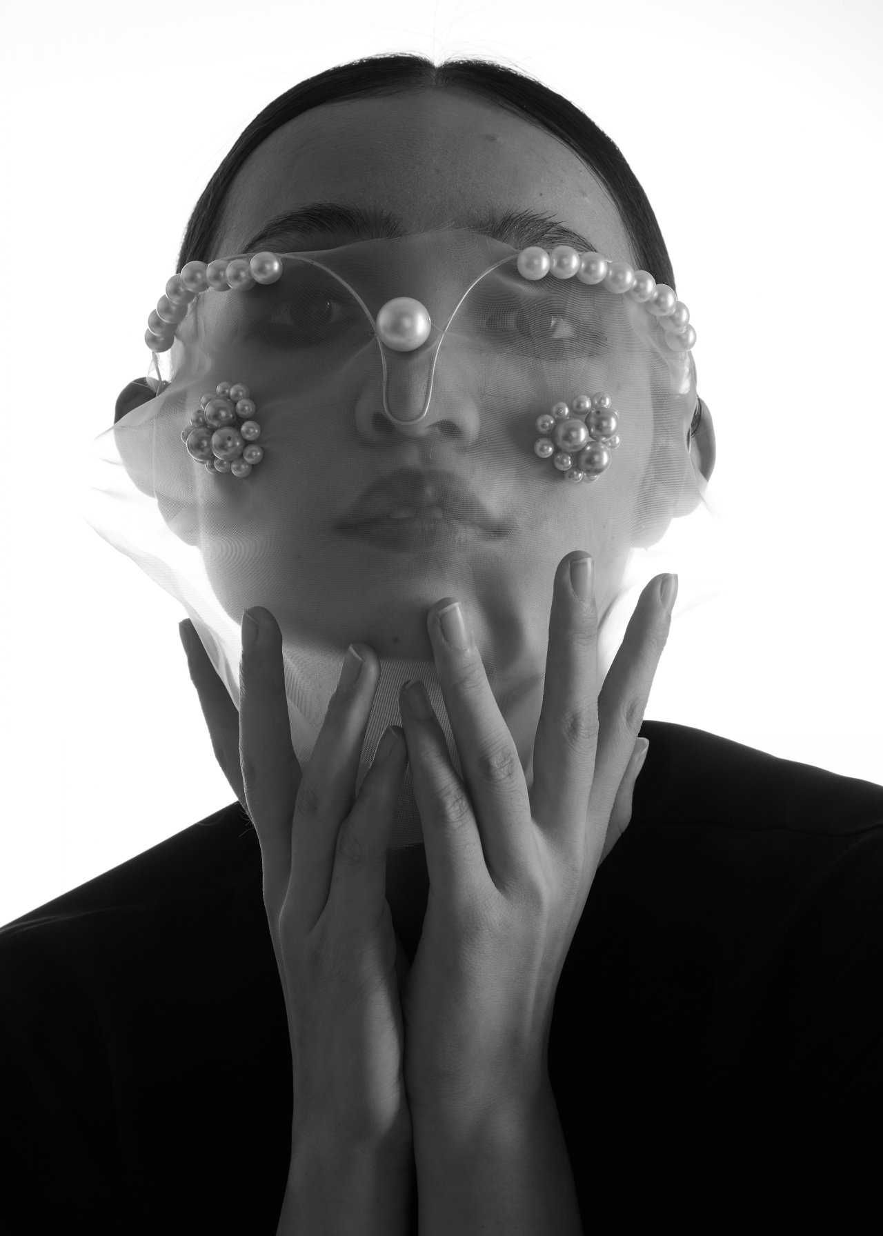 在《保護色》這系列作品中,我以化妝為出發點,創作了一系列可佩戴的面紗首飾。我從化妝教程中獲得靈感,使用銀絲概括臉型和五官的形狀,用白紗覆蓋面部,并用珍珠點綴高光和腮紅。我還運用粘土和金屬制作了可替換的美瞳和假睫毛,這些部分來自于我對同學妝容的夸張觀察。當我佩戴這系列自帶妝容的首飾時,會給我帶來安全感,就像變色龍的保護色。