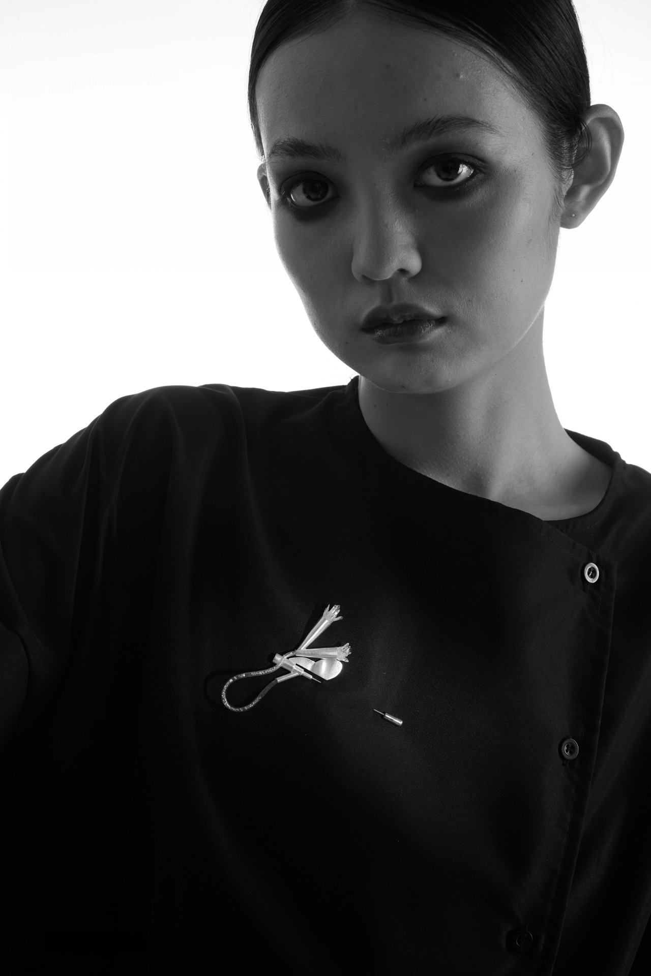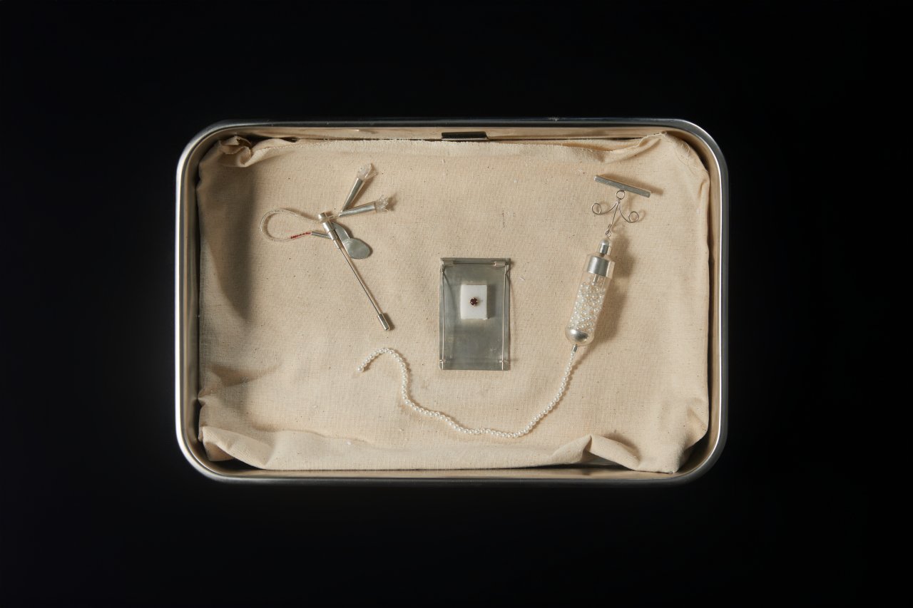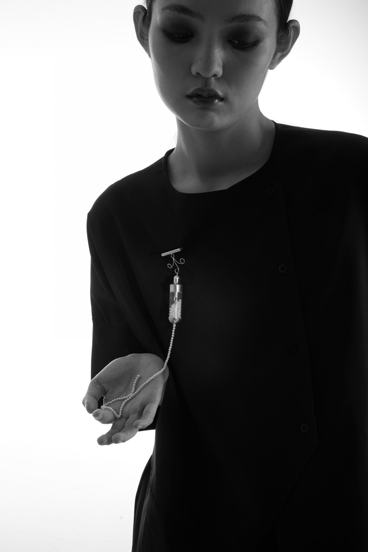 《閃爍的水滴》系列作品的靈感來自于我手臂上的一個疤痕,這個疤痕是在我生病期間由留置針留下的。在我住院治療的一年里,這根留置針一直保留在我的手臂上。隨著時間的流逝,我逐漸覺得它就像是一件飾品被佩戴在我的手臂上。因此,我開始思考將醫療器械轉化為首飾的可能性。在這個項目中,我的三件作品分別來源于與自身經歷相關的三件醫療器械:輸液器、留置針和醫用貼紙。并在作品中加入了珍珠和水晶等材料來表現輸入身體的藥品和我的血液,使作品在還原使用過程的同時也增強了其作為首飾的裝飾性。
