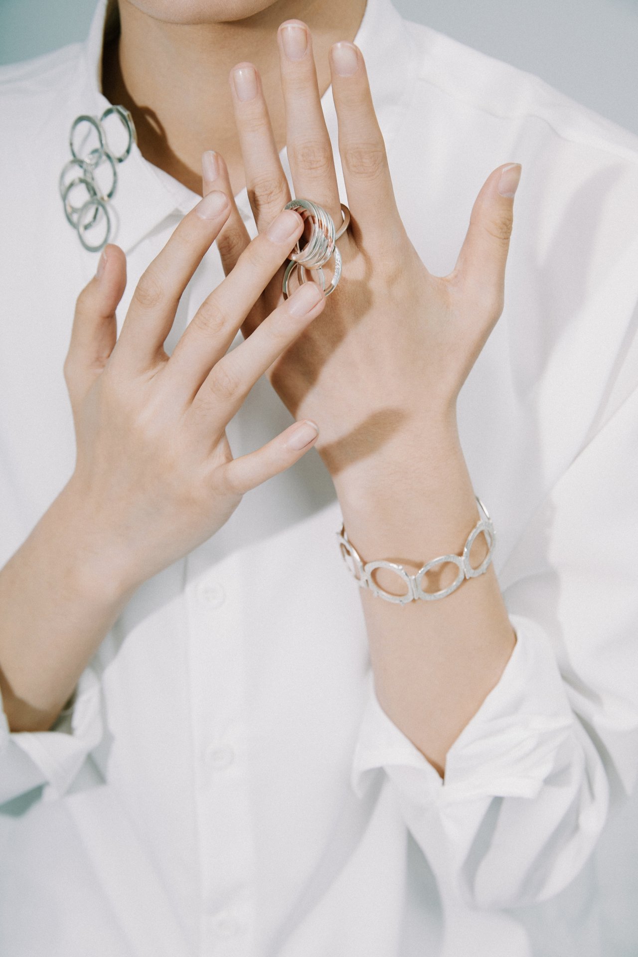 另外我的《圓》探索了珠寶的基本元素——“圓”的可能性,并將它衍變出不同的佩戴方式。我通過重復、疊加、排列或組合多個基本元素,試圖打破常規的珠寶形式,。
