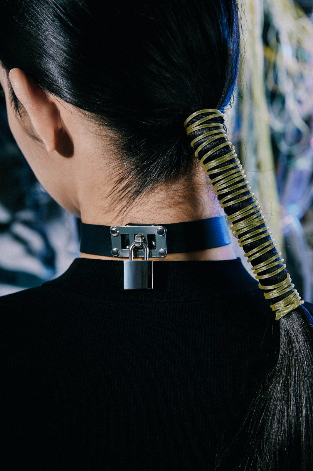 《鈴鼓》是一系列能隨著人體的運動而發出聲音的首飾。首飾和音樂有相似之處,都可以提高人們的精神滿足感和舒適感。受到中國傳統配飾步搖和禁步的啟發,當人佩戴它們行走時,配飾上的金玉相互碰撞會發出令人愉悅的聲音。于是我想通過人們不同的行為來探索人與首飾對象之間的關系,這可能會給觀眾帶來更有趣的穿著體驗和一種獨特的心理感受。