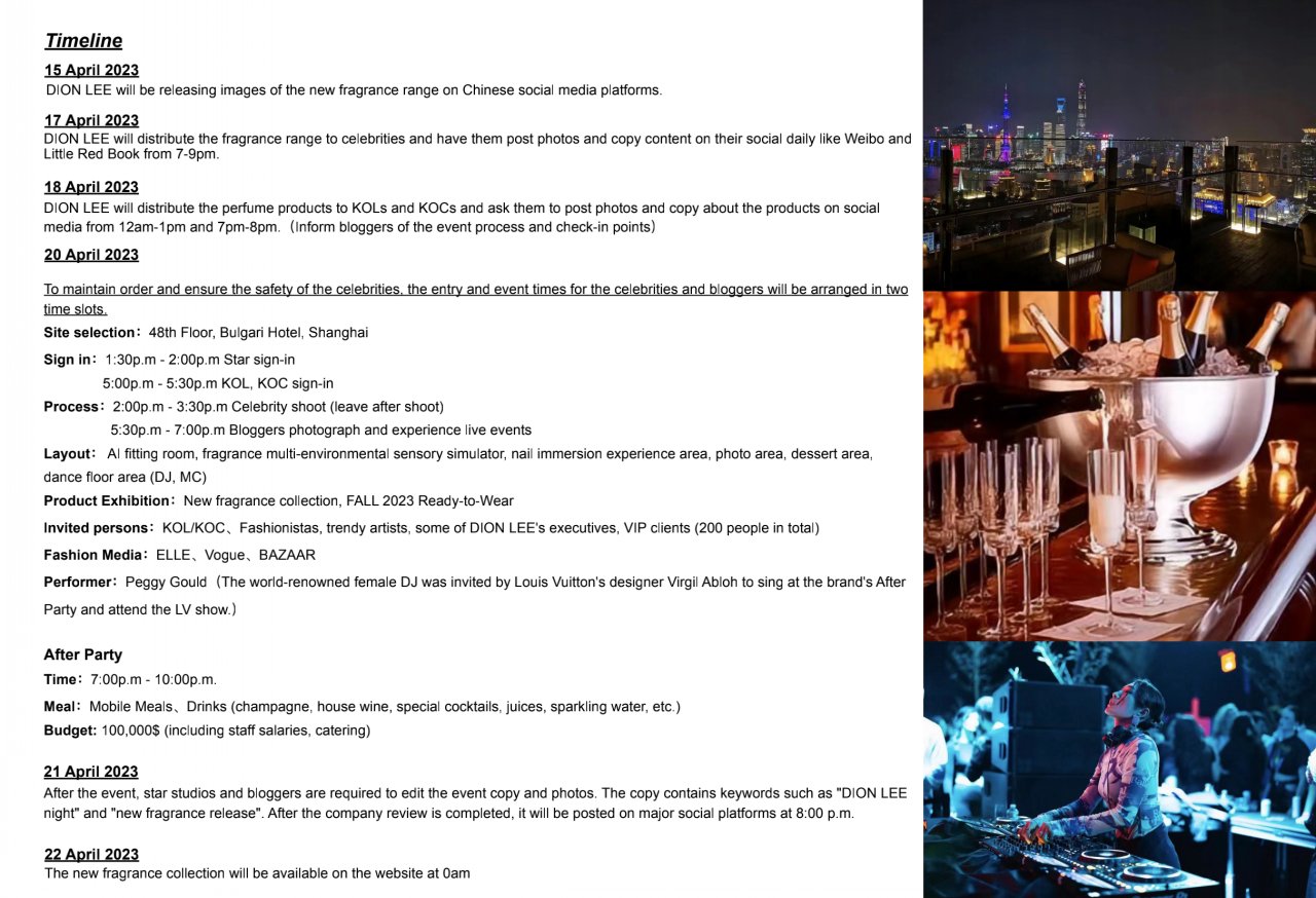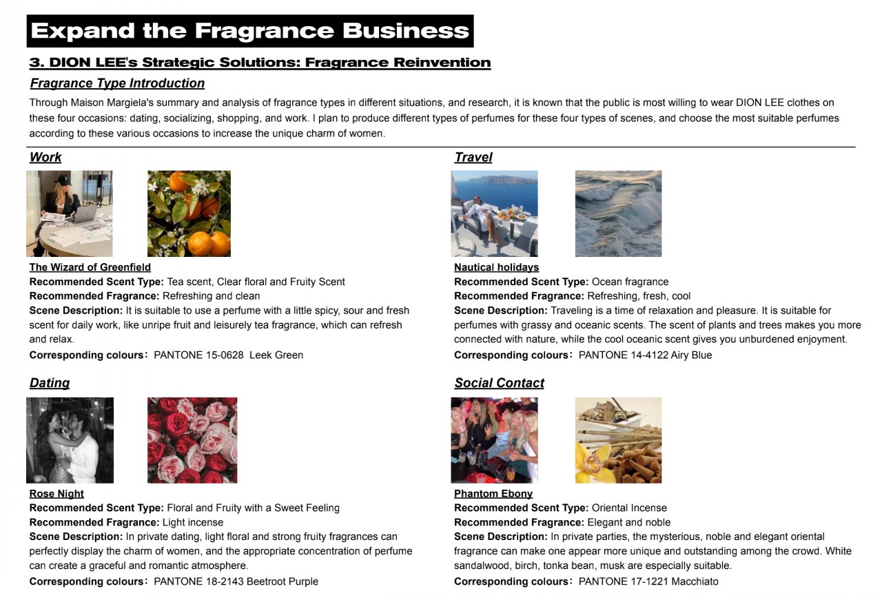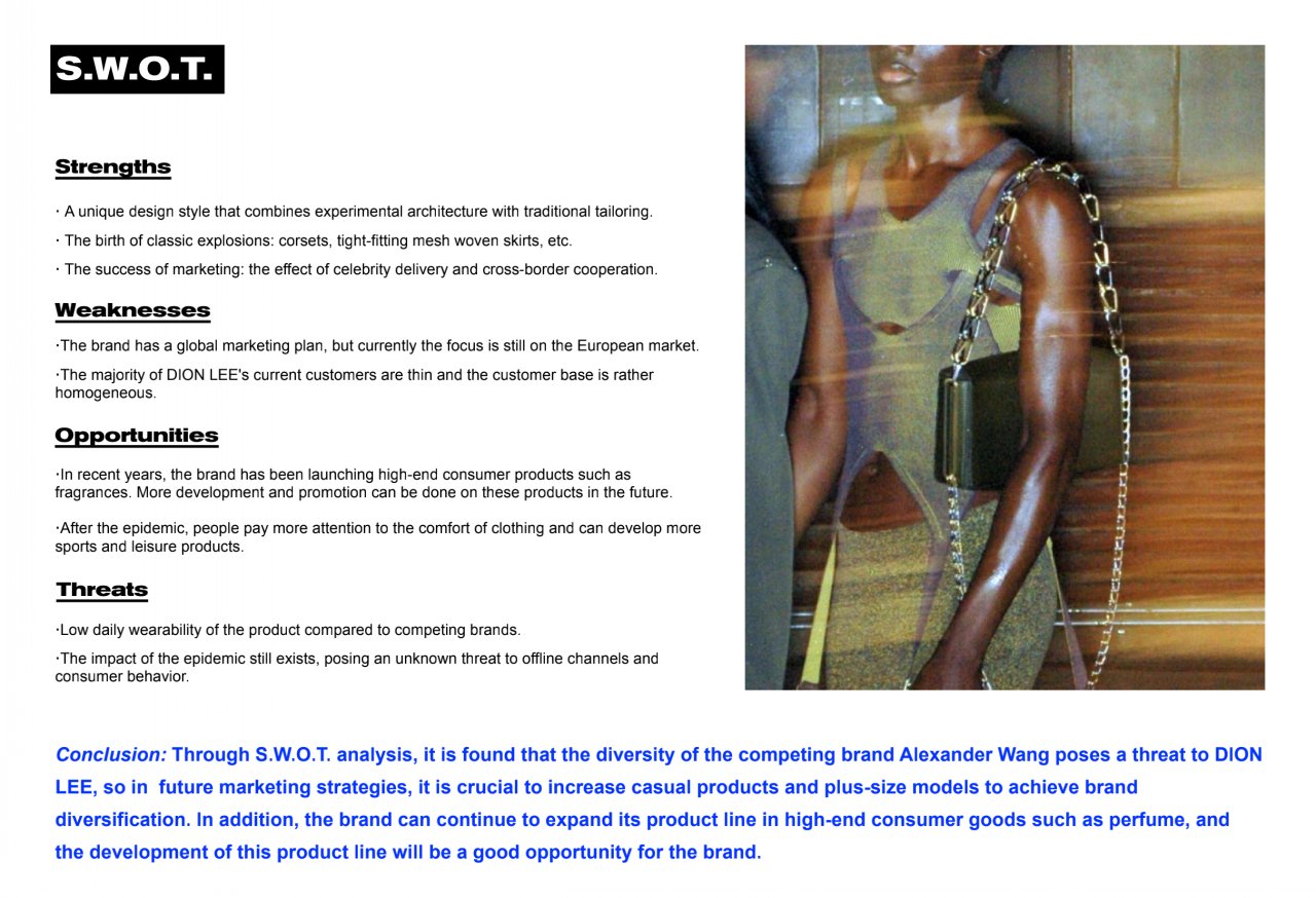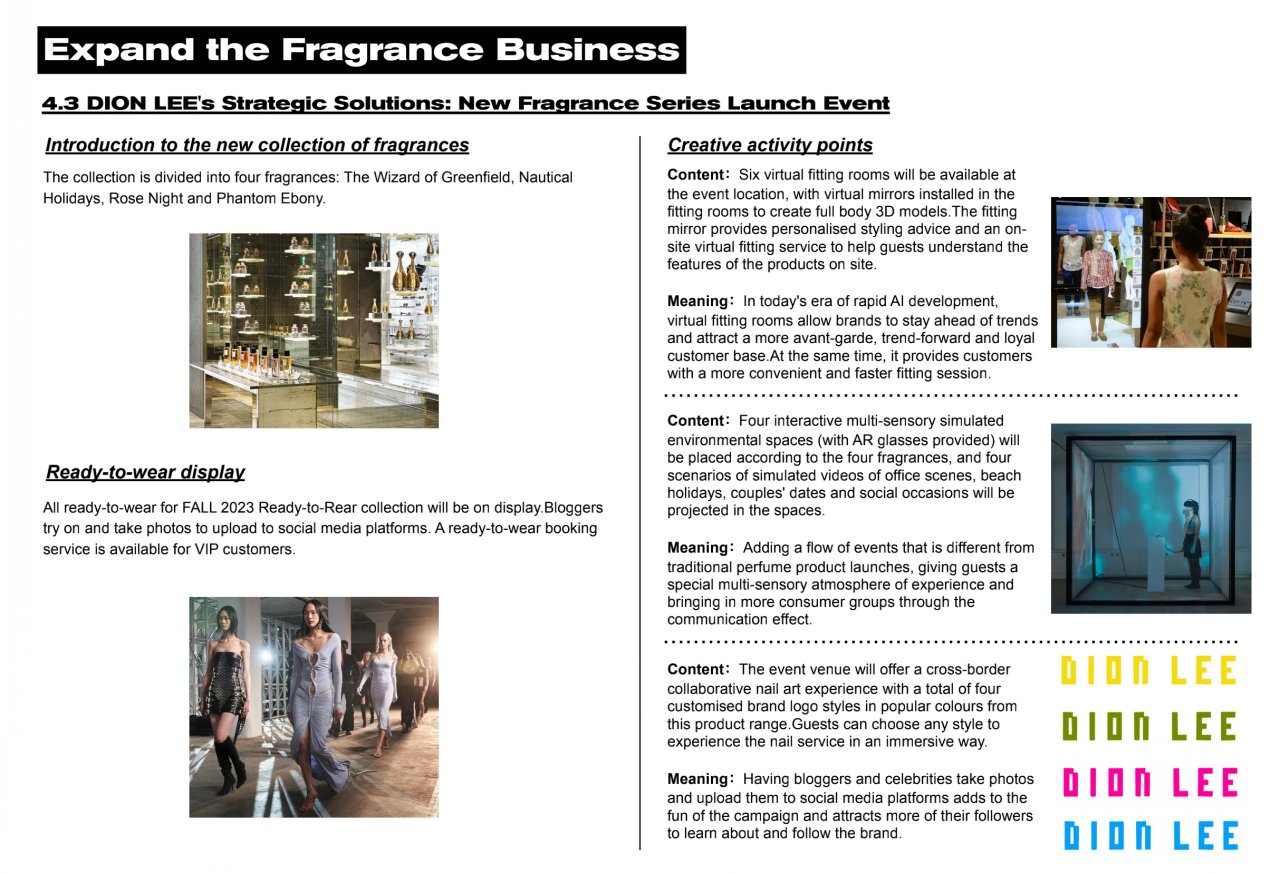 During my one-year study period, I conducted a personal professional practice developing a strategic marketing solution for the Australian fashion brand DION LEE. First, I researched the brand's basic information, including brand introduction, brand positioning and price range, product types and main fabrics, special techniques, brand supply chain and after-sales service, brand's online promotion activities and cooperation with other brands or cross-border promotion activities, and brand's offline stores. After gaining a deep understanding of the brand and combining it with a SWOT analysis and the impact of macro-environment, I found three major problems with the brand: lack of perfume business, insufficient promotion activities, and low daily wearability of clothing. By reading a large number of reports on authoritative fashion business websites and understanding the latest and future sustainable development trends in the fashion industry, I designed and developed a new perfume series for the brand, proposed creative experiential activities to be added to stores, and developed comfortable clothing that will be popular in the future. I also collected and analyzed the psychological needs of consumers in the post-pandemic era through questionnaire surveys and proposed an innovative brand strategy that incorporates sustainability concepts.