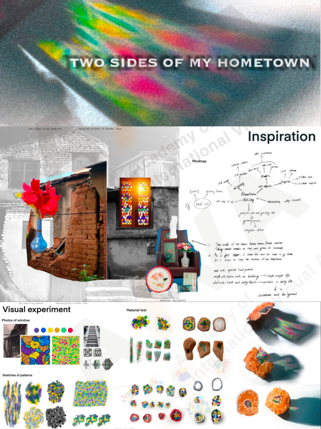 這個作品在材料上做了非常多的嘗試,作者通過一系列的視覺實驗,力圖用各種材料來表現故鄉的一磚一瓦,那些復古的花紋和色調,更重要的是想要表達她心中對于故鄉的一種感覺。