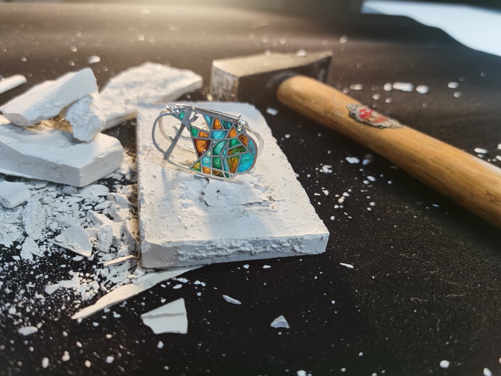 The artwork “Gift for Grandma “emphasizes the interaction between people and jewellery."The broken plaster walls were smashed to reveal the enamel window hidden inside, while the broken wax walls were burned to allow the wax liquid to form a new wall with the window. The transformation of these two works is like breaking the cocoon and reborn, symbolizing my wish for my grandmother to experience a new and beautiful life in the kingdom of heaven.