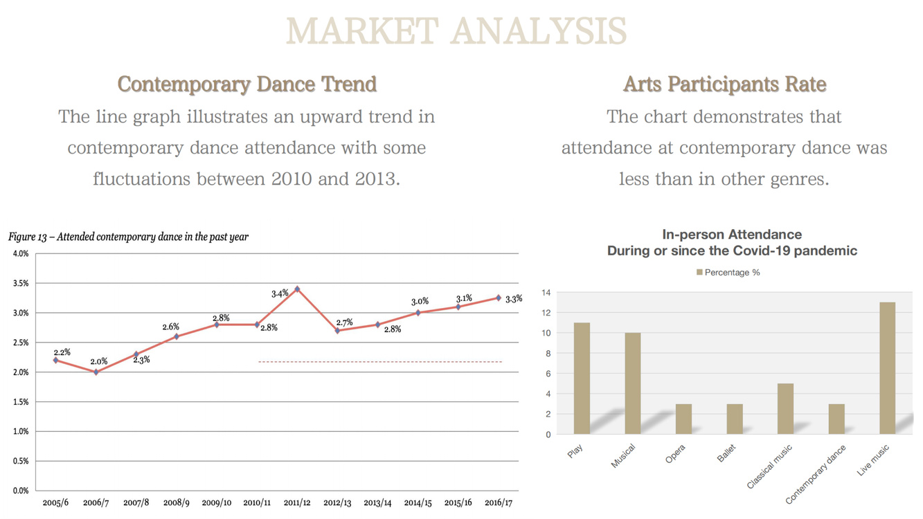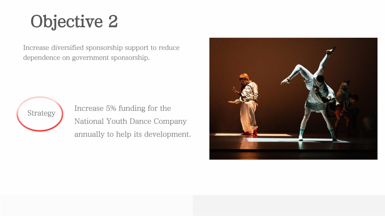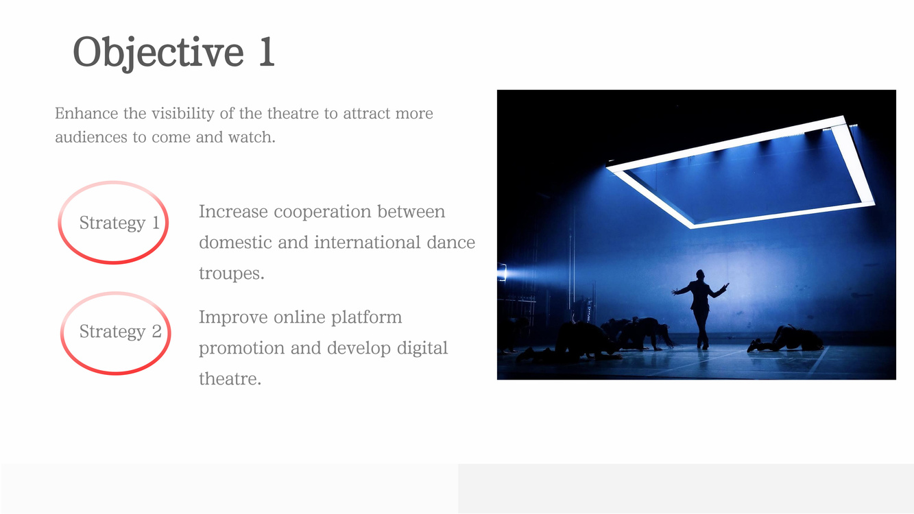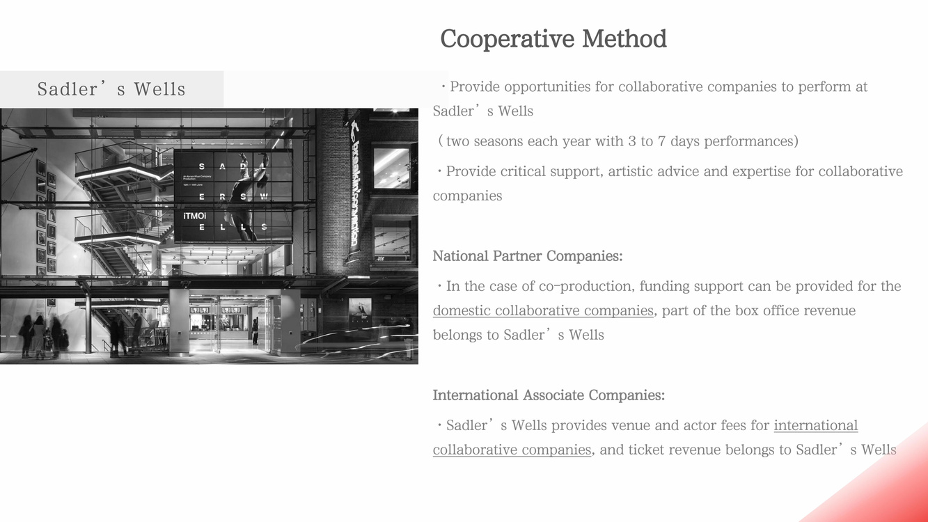 Sadler's Wells Theatre as my main research organization, started with theatre information research, past financial reports, audience groups, collaborative organizations, and their related projects. Then, I applied SWOT analysis to analyze the internal and external strengths and weaknesses of Sadler's Wells Theatre and ultimately developed feasible development strategies for the next three years. Through searching for a large number of reports and art market policies, I found that the theatre still faces funding shortages despite Brexit, Leveling Up Policy, and the impact of the pandemic. Therefore, I have created dance troupe collaboration and educational project fundraising plans to address these issues. I proposed digital theatre and sponsorship packages, in order to improve their facilities and training programme for pre-professional dancers.