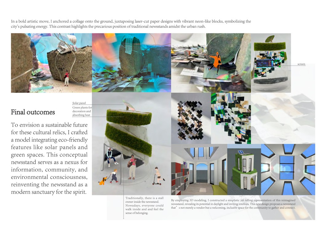 In the second project <Reflecting on Shanghai’s Evolving Landscape Through Newsstand>, my journey growing up in Shanghai over the last two decades has been marked by significant transformations. Newsstands, once vibrant hubs of printed media and community interaction, stood as familiar fixtures in my childhood. They were places where one could purchase the latest periodicals and engage in casual conversation with the congenial proprietor. Yet, the digital revolution has rendered these quaint icons obsolete, as they succumb to the relentless tide of internet proliferation. This work delves into the dichotomy between Shanghai's accelerating urban rhythm and the newsstands' languishing presence. It's a visual and conceptual exploration of how the slower pace of yesteryear is being eclipsed by the city's rapid tempo, leaving only echoes of the past.