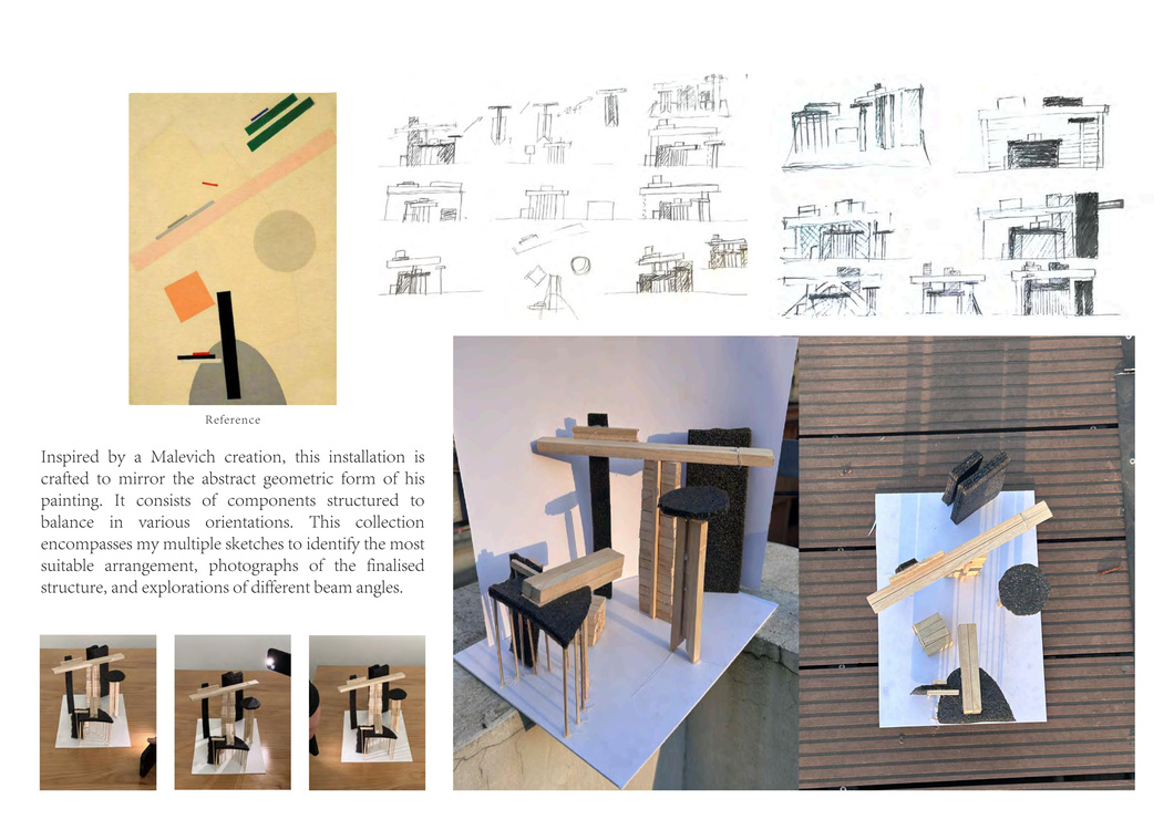 最后在《超現實主義對建筑設計的影響》項目,以我偏愛的藝術家馬列維奇及其標志性的超現實主義風格為題材,向他致敬。它旨在解構和重組他的一幅藝術作品,構思出一種能夠展現超現實主義對建筑設計潛在影響的裝置。
