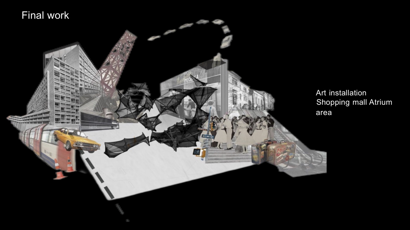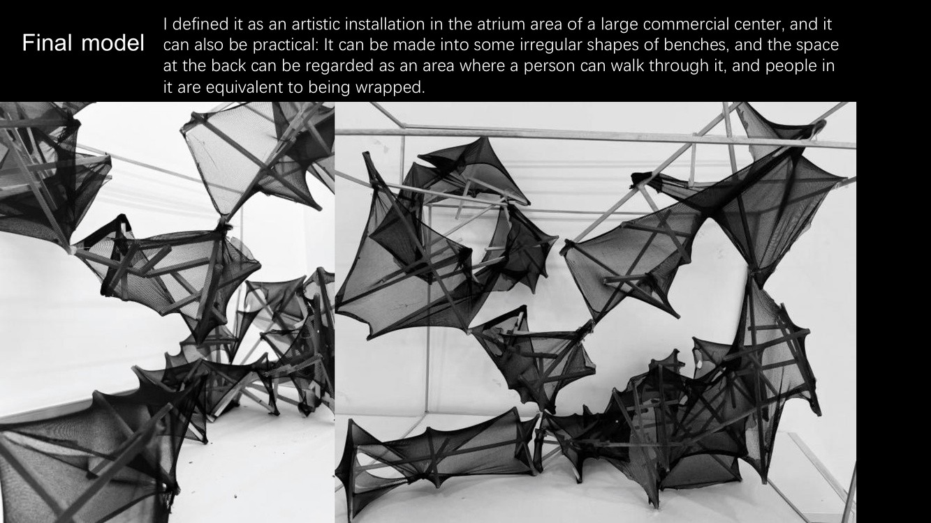 預(yù)科期間的第一個(gè)項(xiàng)目《soft space》的設(shè)計(jì)靈感來(lái)自于鹽田千春作品中對(duì)于的網(wǎng)和線使用。作為初學(xué)者我通過手部動(dòng)作和絲網(wǎng)的翻折拉伸建立了對(duì)空間和建筑骨架的理解。通過模型構(gòu)想了一個(gè)綜合商業(yè)中心中庭區(qū)域的藝術(shù)的裝置我希望他可以兼具實(shí)用性和觀賞性,因此我將他的一部分設(shè)計(jì)成:可一些不規(guī)則形狀的長(zhǎng)凳,而后方空間設(shè)計(jì)為行走通道,體現(xiàn)了我在模型制作期間對(duì)包裹這一視覺語(yǔ)言的運(yùn)