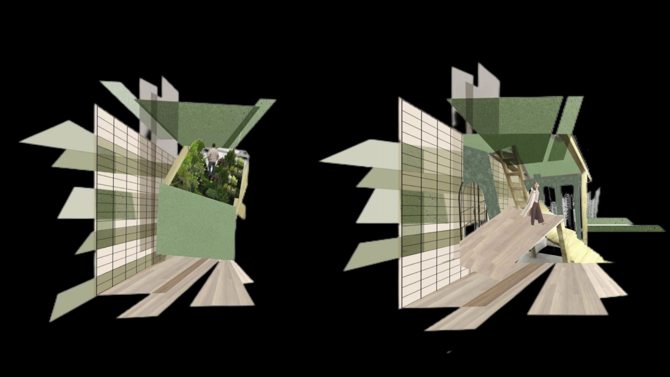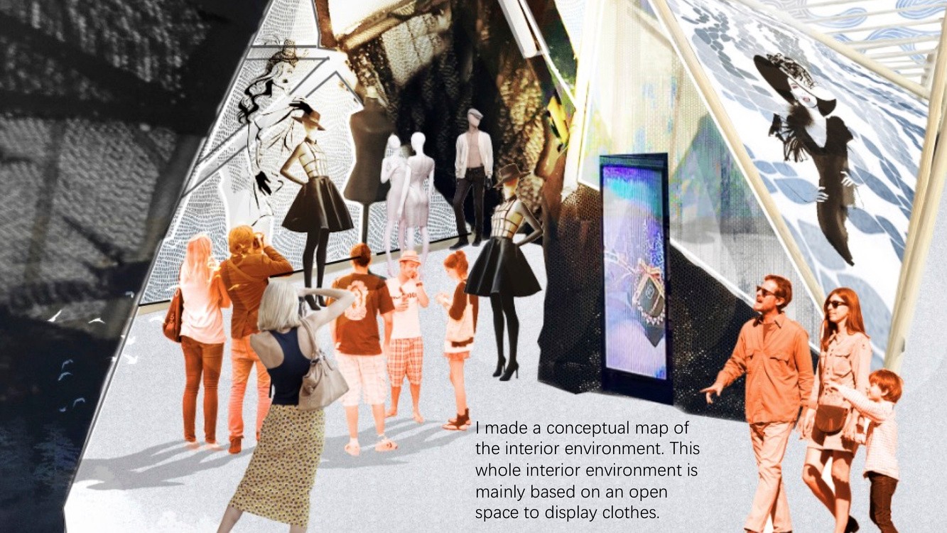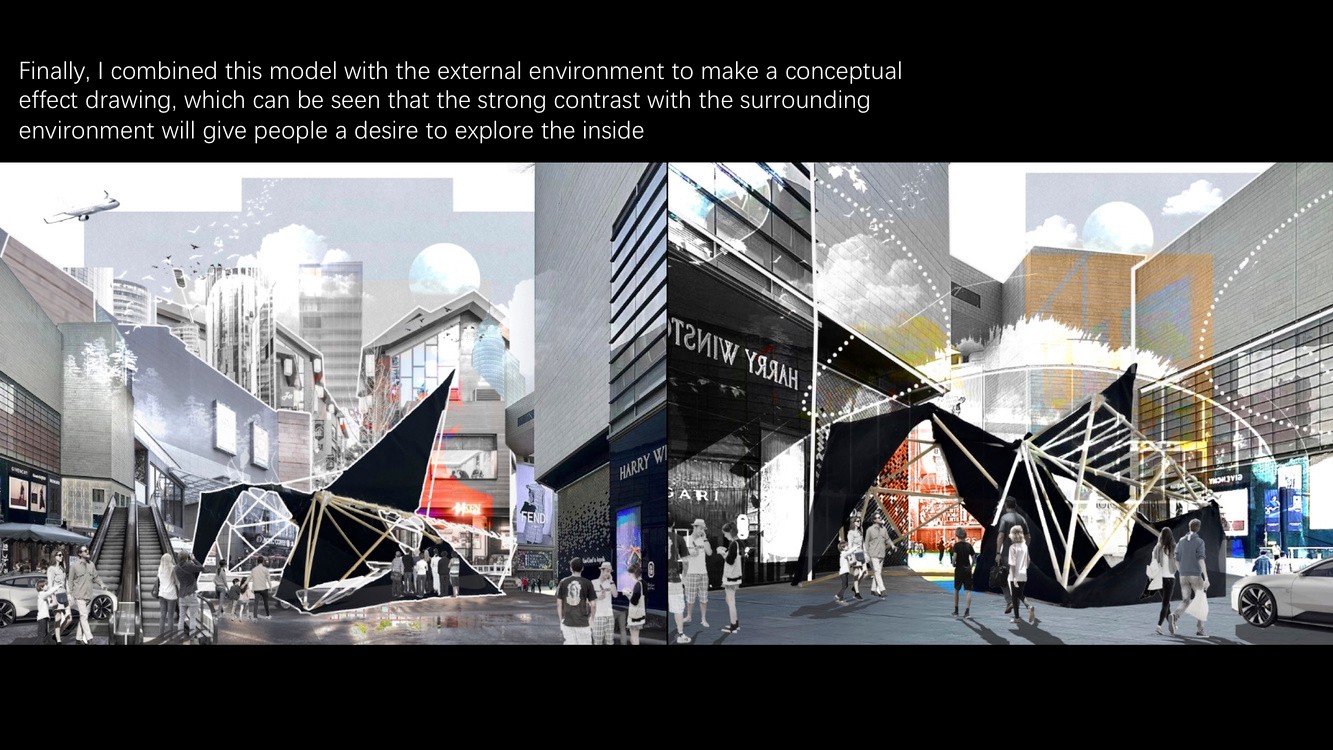 《A sense of distance and belonging》是我為Prada設(shè)計(jì)的一個(gè)快閃店。在建筑整體的構(gòu)建上我參考了Prada服飾的一些廓形和剪裁,運(yùn)用棱角分明的線條和大量的三角體確立了建筑的造型基礎(chǔ),并決定用Prada標(biāo)志性的尼龍面料作為建筑的墻體。同時(shí)我將這個(gè)建筑設(shè)計(jì)為半開發(fā)的結(jié)構(gòu),透明玻璃與實(shí)體墻形成對(duì)比,聯(lián)系了一部分的內(nèi)外空間,也為使觀眾帶來(lái)輕松的氛圍。而尼龍布則會(huì)將部分展陳內(nèi)容遮擋,以此增加神秘感,吸引外部觀眾進(jìn)入店內(nèi)探索。
