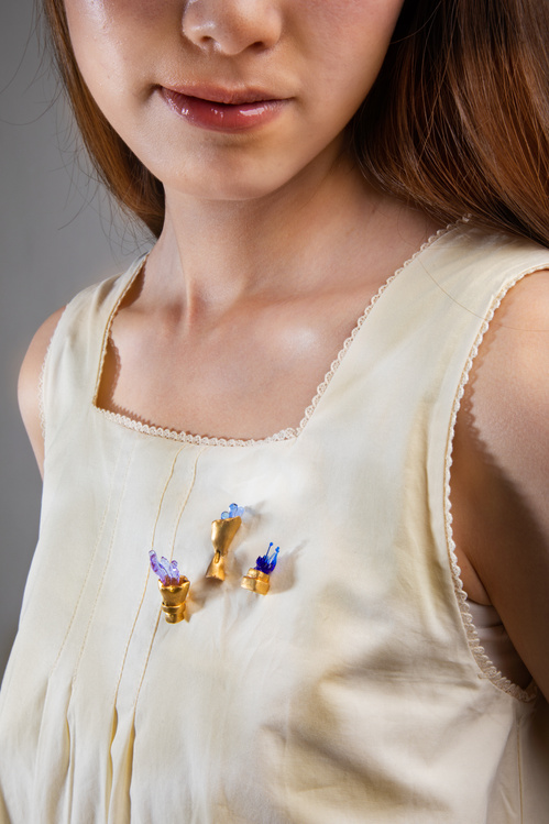 From a very young age I have been good at observing the details of daily life and drawing inspiration from them for my creations. I really like to try and explore different experimental materials, so the use of different materials is also an essential aspect to consider when creating my design projects. In my work “The beauty of the rejected”, I used the flowers that fall on us as inspiration for my jewellery design. In this series, I have experimented with wax casting and combined it with glasswork to create a series of containers for these objects to express my belief that these unassuming beauties are the gifts that life brings to us.