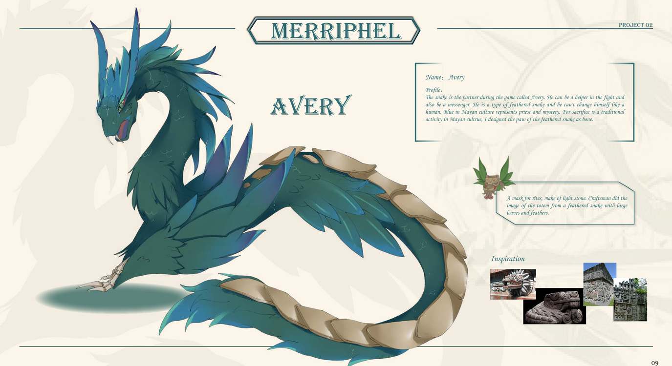 In my work Merriphel, I chose the Maya culture as the background for character design. However, I also combined elements from the Aztec culture, the sister culture of the Maya, into the related backstory. The Maya and Aztec cultures have many similar yet distinct features, which which provides a rich foundation for creative design. In this project, I designed props and items made of materials commonly used in Maya rituals, such as stone, wood, and bone, for each non-player character (NPC).