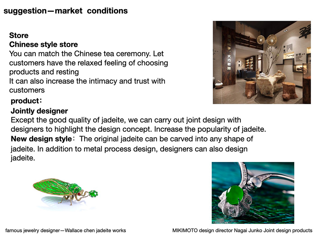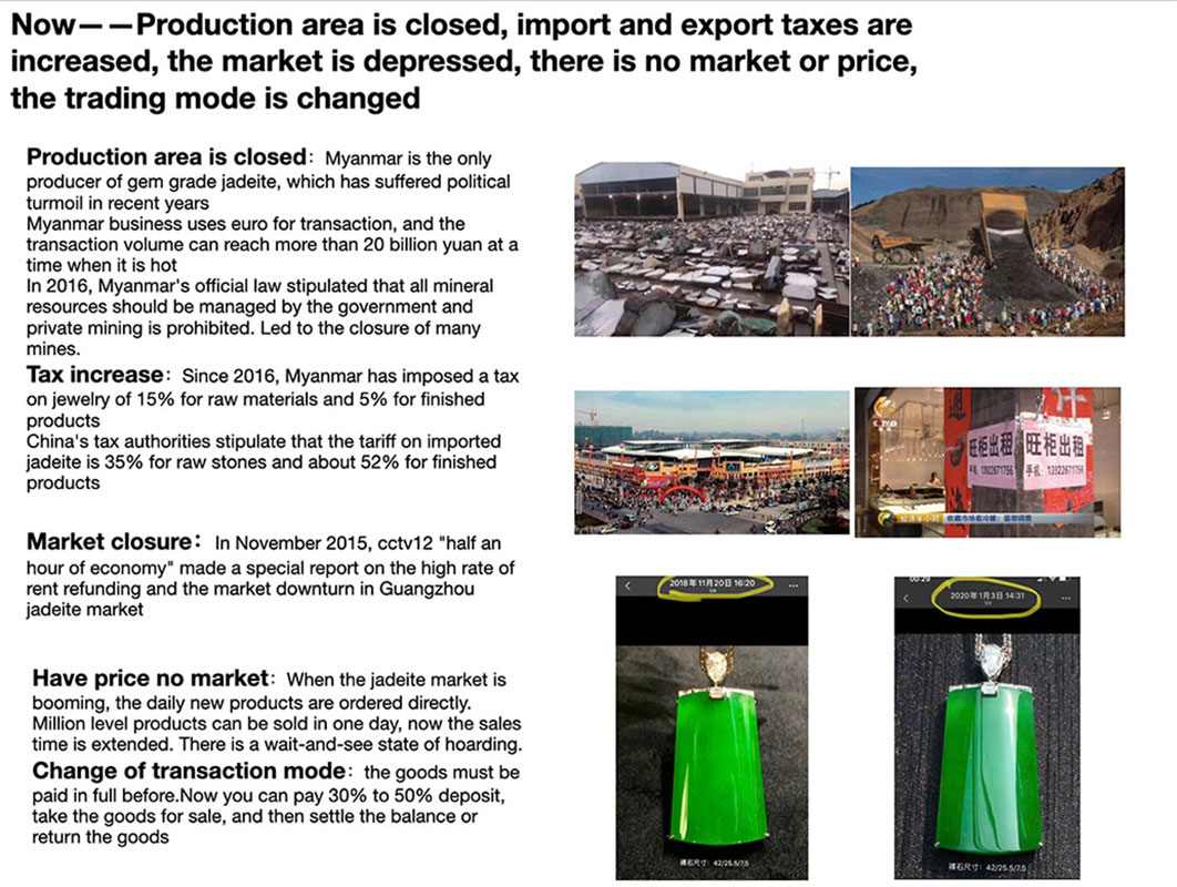 2013年全球經濟碰到了平緩期。2020年冠狀病毒讓市場經濟受到了嚴重的打擊。雖然二手奢侈品市場還是有成交量,但是這個成交量背后的含義不是經濟的復蘇,反而或許是經濟奔潰的預兆。翡翠成為了高價商品,但卻進入了無人購買的尷尬狀態。我做了市場調查、消費者和從業者的訪問,想去了解:他們怎么看待現在的翡翠市場?怎么看待產品的設計和價值?從業者的悲觀和消費者的熱情產生了矛盾。這是雙方對翡翠價值認知上的明顯區別。