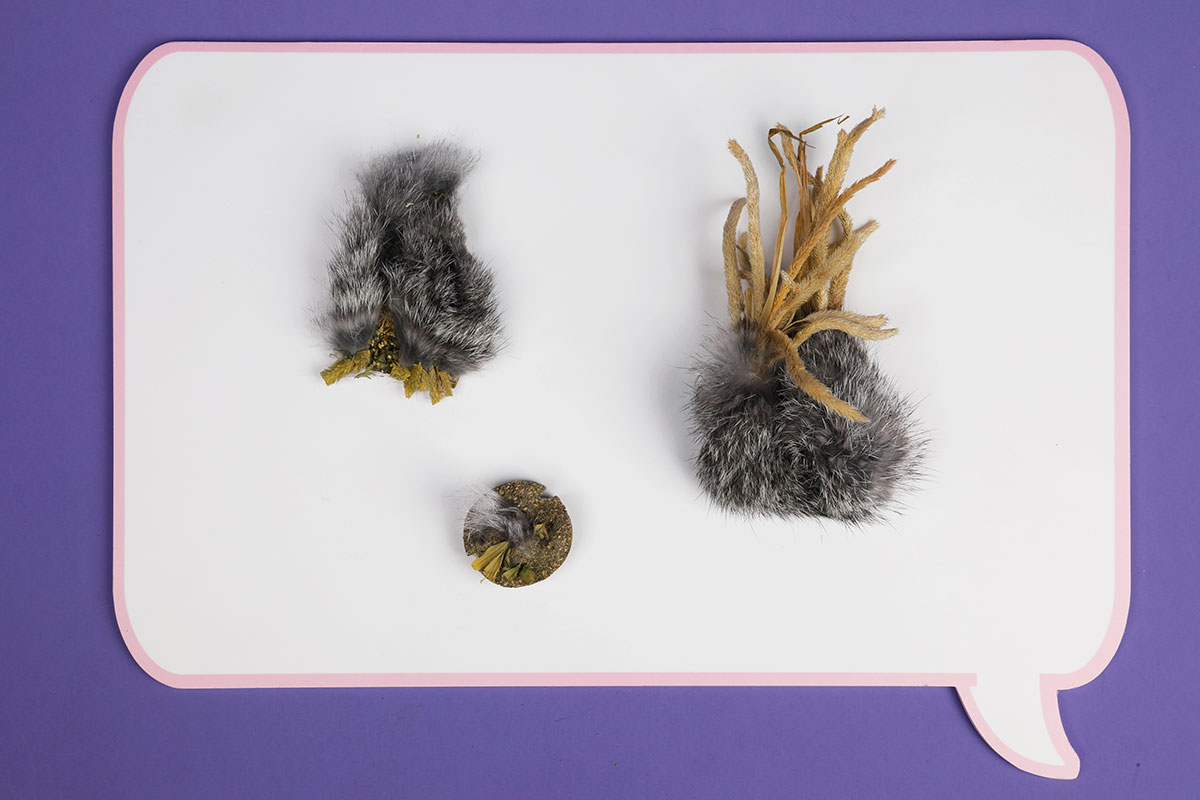 我一直在不同的創作中嘗試創新的材料。在我的最近的作品《陪伴》里,我嘗試了兔毛和兔子草料的結合來紀念寵物兔給我帶來的快樂時光。通過不斷的實驗探索,我最終完成了四件作品,并通過材料的特點鼓勵觀眾感受兔毛的順滑與兔草的清香。