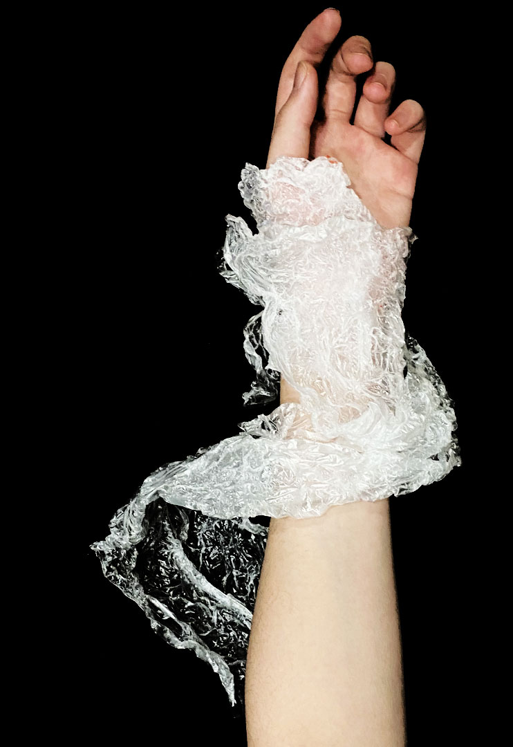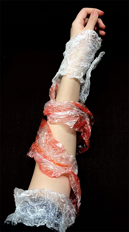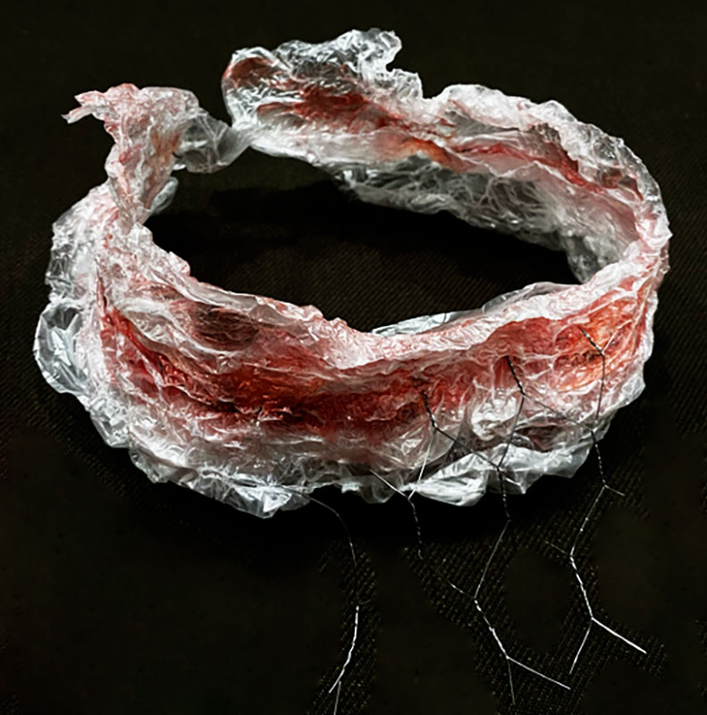 I prefer to use found objects as my materials to make narrative jewelleries. I like to hide a long story behind the jewellery because it gives you a view of the hidden beauty. In the work I made about the love of my grandparents, I used their photos and the red rope as the found materials. In the meantime, I also express my feelings to the audience through jewellery, from the missing to my family to the anxiety about the worsening environmental pollution in my hometown. For example, in the work I did this year, I used plastic bags, which are collected from the seaside as the material to simulate the appearance of marine creatures being entangled by plastic. This jewellery design shows the severity of Marine pollution.