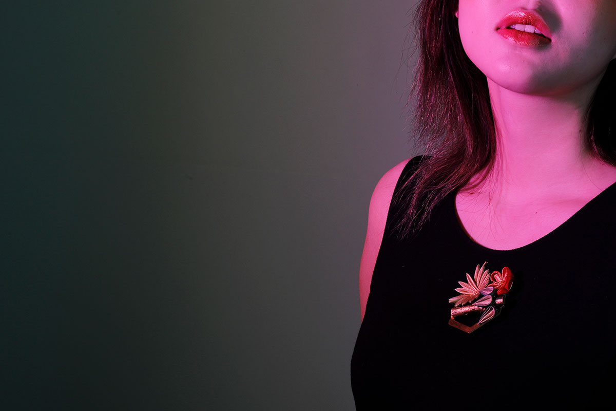 我的作品大多是關于自我的探尋。我的第一個作品《失去的時間》是為了在心底留住童年的自己所制作的。為了更好地留住童年的記憶,我把記憶的碎片做成胸針來紀念我失去的記憶,形成一種仿佛童年記憶從未消失的感覺。我的第二個作品《遙不可及》是我對自己身體部位探索后所做的作品。我借用首飾使自己的身體部位產生不可達到的視覺效果。我的第三個作品《初心》是表達理想自我狀態的一個作品。我將多種材質結合,最終呈現忠于自我,保持初心的感覺。