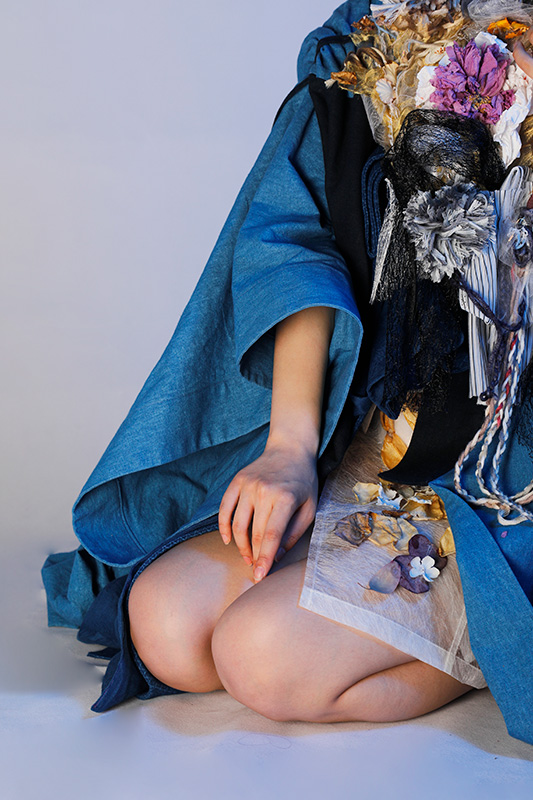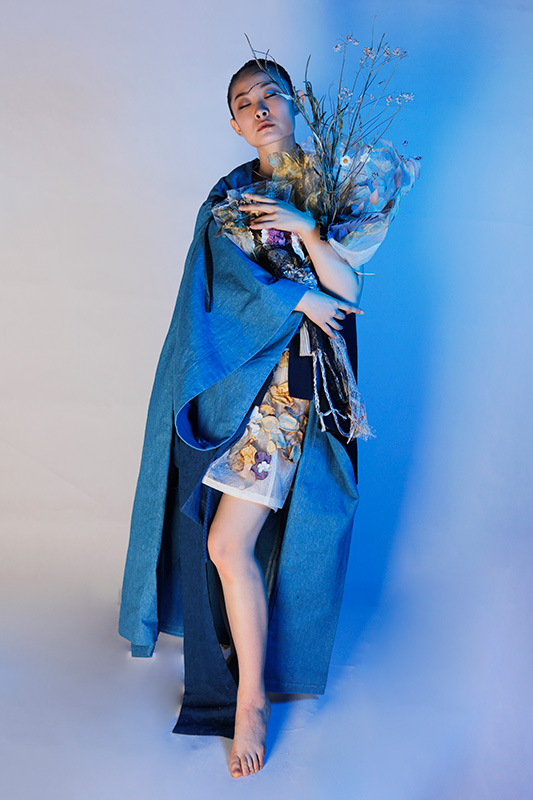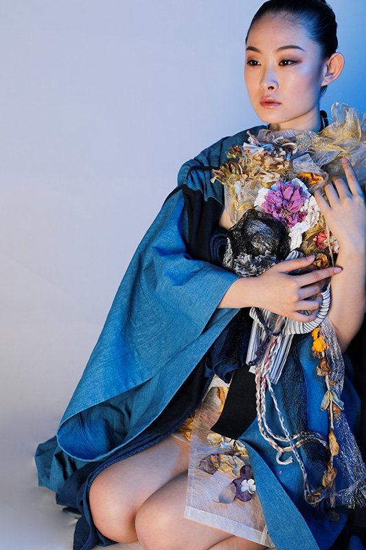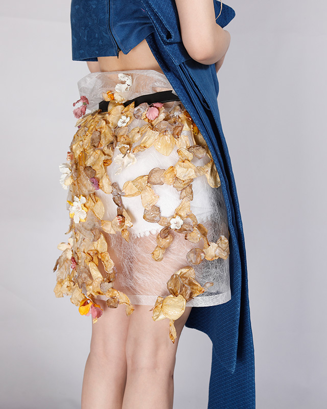 The artwork <Spiritual practice> tells the story that Angela likes to learn and practice in different ways in her life. In the process of IKEBANA, we use the method of meditation and tea to touch the spirit. And we use the form and ritual of the ikebana as a media to convey the understanding of yourself and your surroundings. The garment structure itself is used as a container and also a part of the ikebana. In the process of fusing different textures, I completed the ‘Practice’ of communicating oneself.