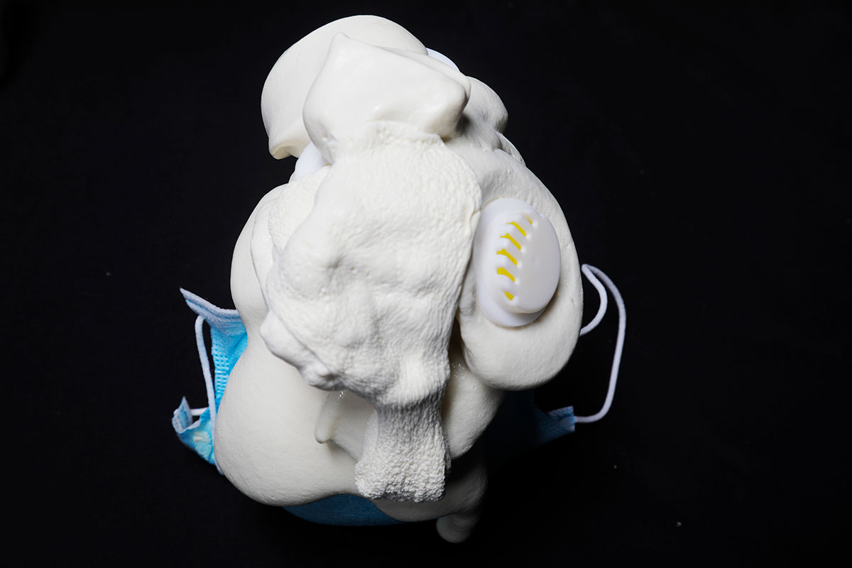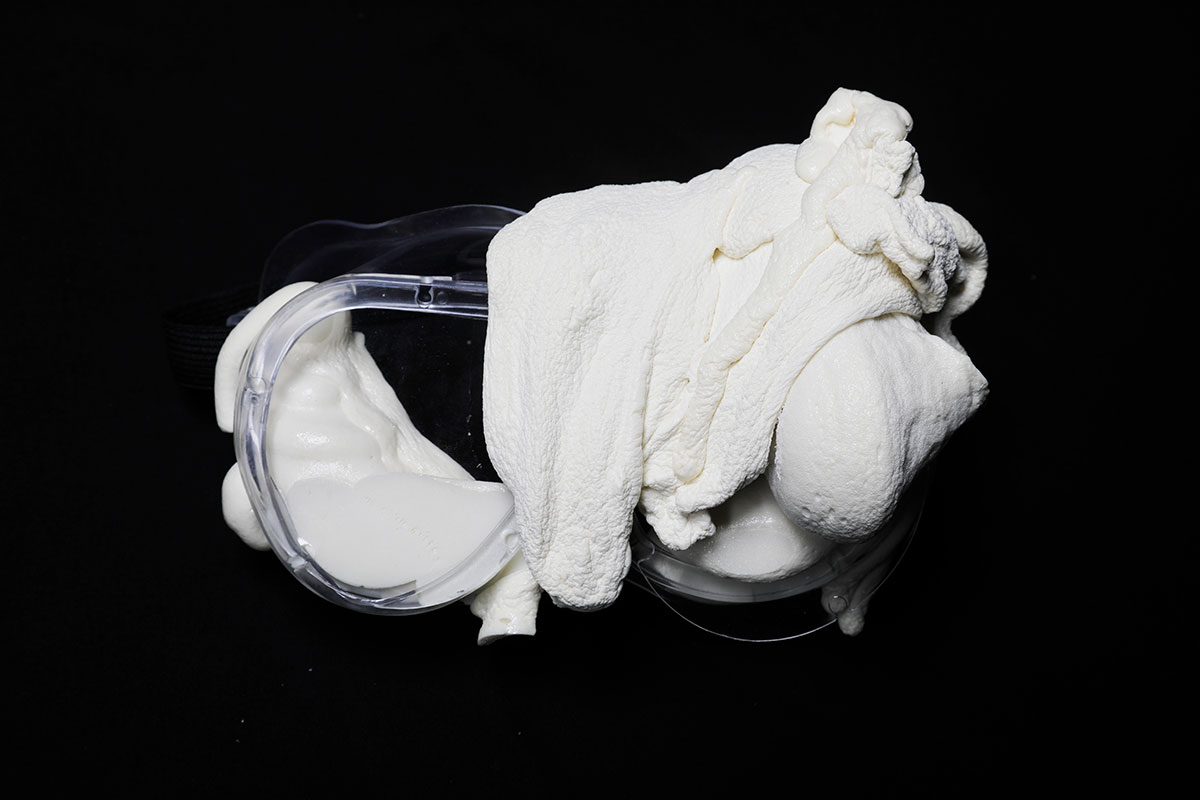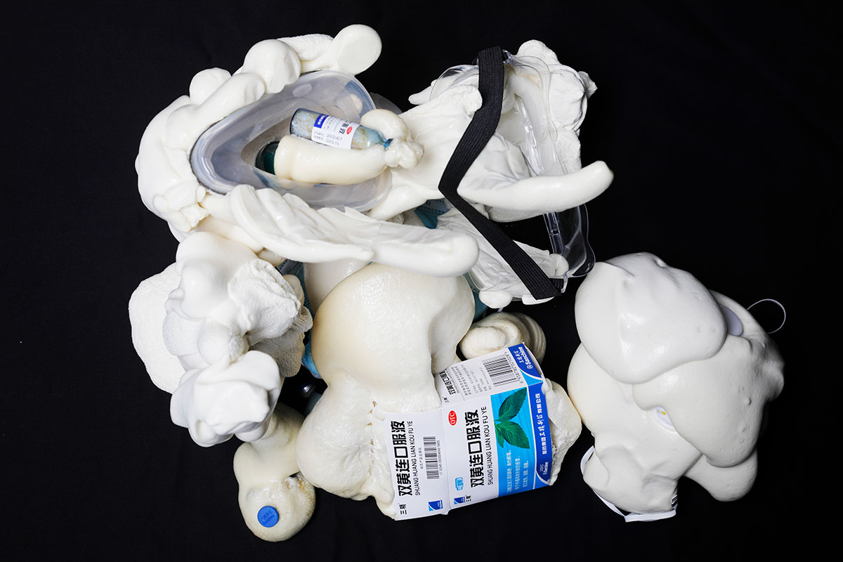 我的藝術(shù)實踐是在使用視覺語言來討論一些社會現(xiàn)象或探索。比如在最近的作品《價格》中,討論了疫情期間畸形的不受控制的防疫用品漲價現(xiàn)象。通過夸張的藝術(shù)手法來凸顯這些產(chǎn)品的暴力溢價。材料上也基于這個觀點,使用了多種低密度與可膨脹性的泡沫作為材料;并通過染色、發(fā)泡、定型、固化等方式使其與防疫用品結(jié)合,來得到預(yù)期的視覺效果。