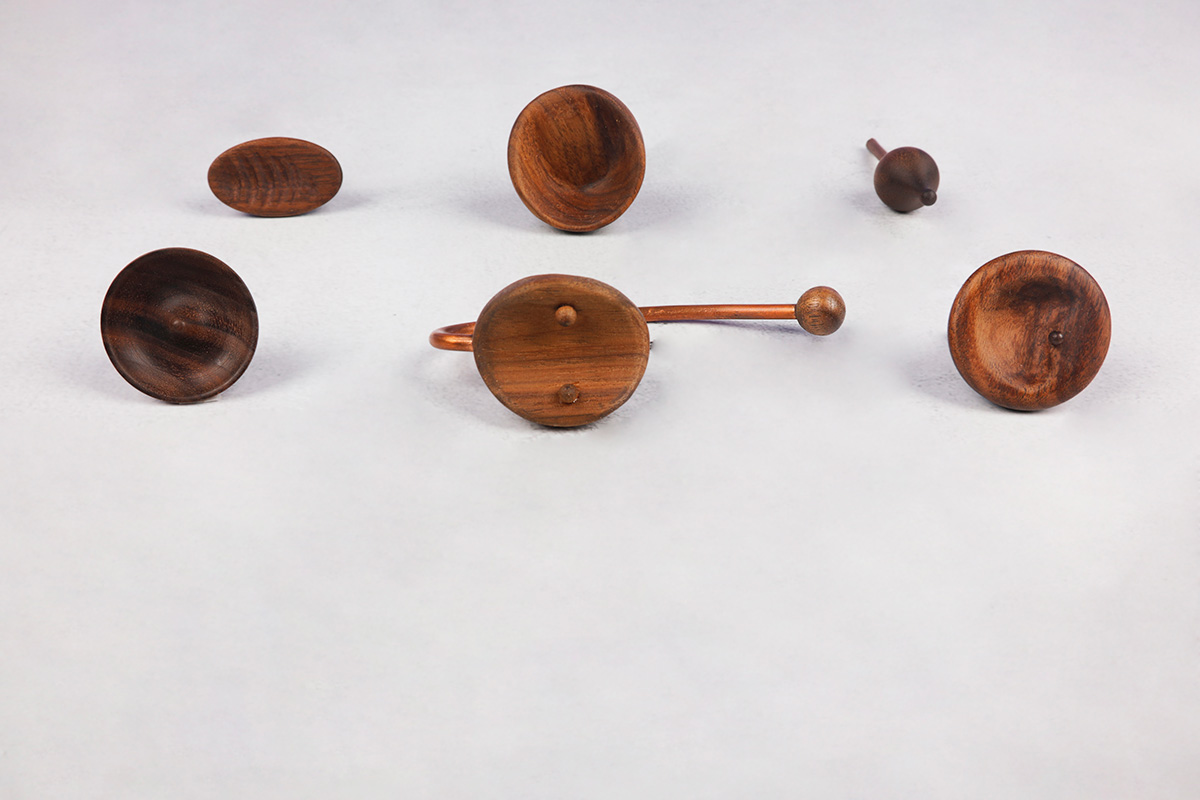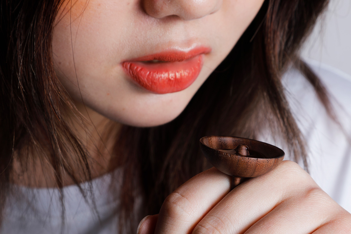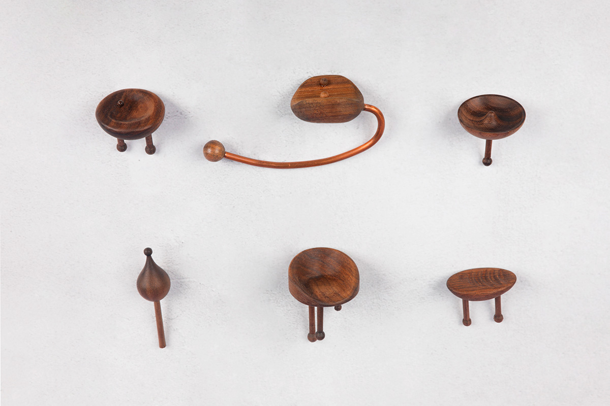 她的作品《感官體驗器》將首飾與餐具結合拓展了首飾的外延,強調觀眾的使用過程。她受到“聯覺”心理現象的啟發,將木材作為感官體驗器的材料。她研究了吃飯時的口腔運動,給觀眾更多的飲食體驗過程。她希望觀眾通過工具與食物溝通,并認識到品嘗食物的重要性。
