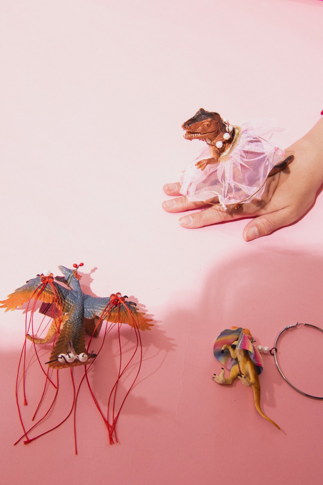 孩子的性別認知基本來自于長輩的引導以及身邊事物的影響,不同的認知過程都可能造成孩子們不同的性別差異。我的第二個作品《Dinosaur in a Skirt》講述了自己的故事,恐龍是我從小最喜歡的玩具,但在大人眼里身為女孩的我應該玩女孩子該玩的玩具,比如娃娃。這一系列首飾通過玩具恐龍穿女性服飾和佩戴珍珠元素的飾品來討論社會對兒童的性別刻板印象,同時引發(fā)觀者對兩性平等的思考。