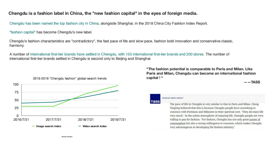 My third project was inspired by the report "2018 China City Fashion Index Report", which rated Chengdu the same as Shanghai as "China's first-tier fashion city." Therefore, I try to explore why Chengdu has become a trend label in China in my project. From the basic geographical situation of Chengdu, people's habits of work and rest, consumption values, and the development of Chengdu popular logo culture to analyze and study the causes. Therefore, I interned in Shanghai Fashion Week for two weeks to study the market driving factors of the Chengdu clothing retail market. The reasons for the booming e-commerce business in Chengdu? How to divide the Chengdu market more detailed and Chengdu multi-brand operation way? Finally, I summed up the future trend of the Chengdu tide market from two aspects of development and trend.