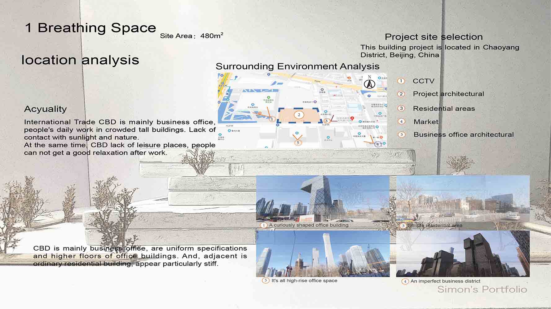 In the process of learning architectural design, I realize that the needs and definitions of architecture are different among different people, and the same architecture also needs to take into account the needs of the times to change. Breathing Space》. of Works By investigating the attitude and work and life needs of CBD people, I finally combined the global epidemic factors. I hope that the form of architecture can be more diversified than a single situation. Through some personal experiences in recent years, some people do not want to make creative changes, but to make a single copy in the general environment. Simple steel frame, glass building, at the same time cause great visual fatigue. Make art progress slow.
