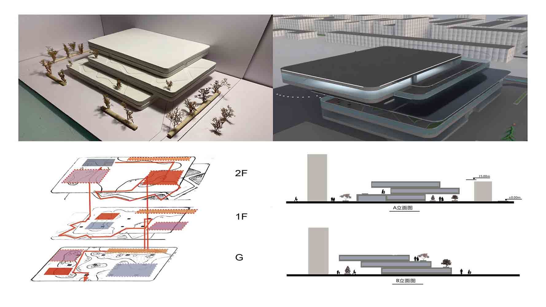 My work not only discusses the needs of people and the factors of the surrounding environment, but also considers what kind of building can make people more safe and better relaxed in a tense environment. So I used indoor greening landscape, so that vegetation can better release oxygen, and through a large number of glass transparent, into the sun. Also can in the crowded environment, very convenient to come outside to breathe fresh air.