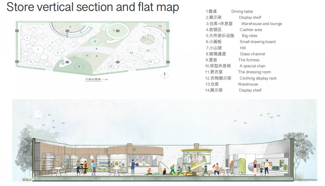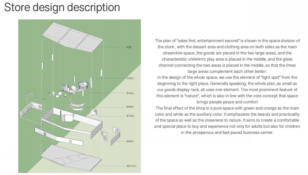 The last project, Breathe Experience Store is a shop design in a commercial center. The shop's visual effect is a purity space with green and orange as the main colors, complemented by white, which emphasis on aesthetics, practicality as well as closeness to nature. It aims to create a comfortable, unique spot for adults and children to purchase and enjoy in a busy, fast-paced shopping center.