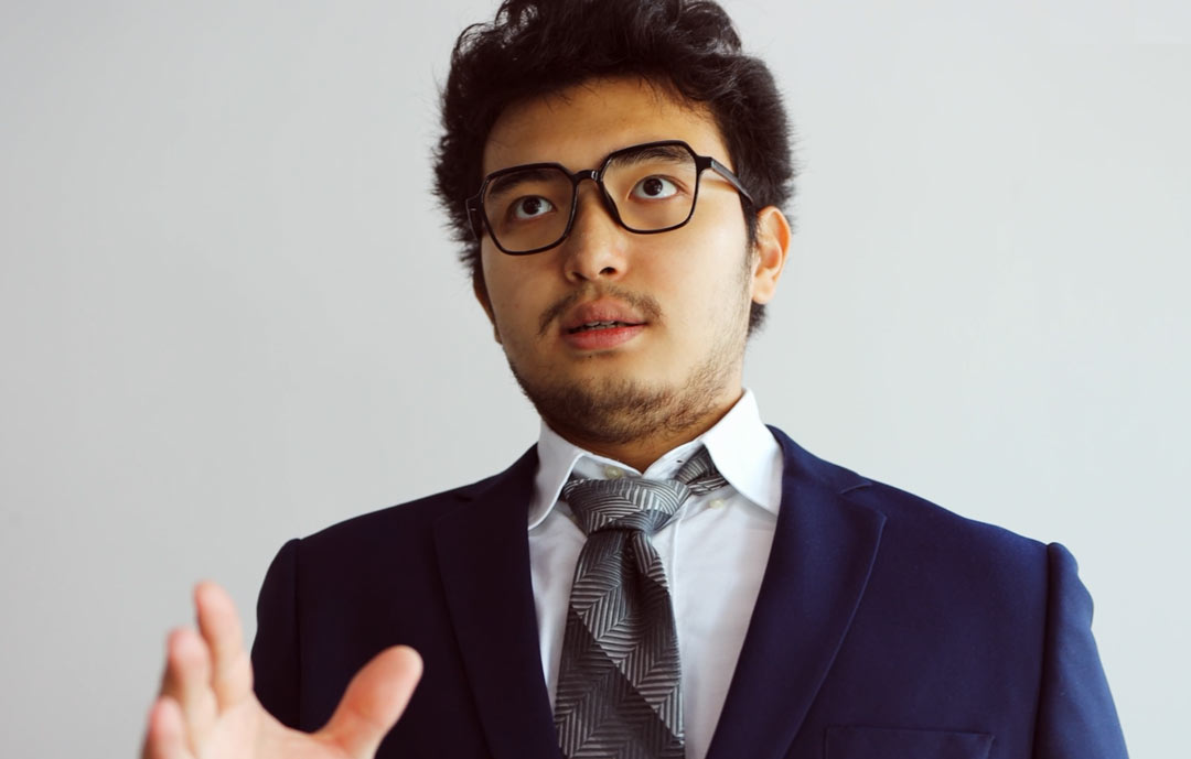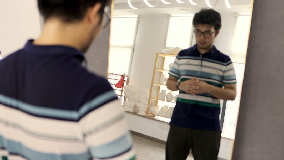 我是一個熱愛創新、靈感來源不斷且追求智慧的人。在我看來,生活中的一切都是嶄新且獨特的,電影藝術也更應是如此。《與時間賽跑》(Racing with Time)是一部探索了主角因時間限制,心態發生巨大變化,影響了他所見事物的微電影。末尾鐘的倒掛與準時、空蕩的大廳,象征主角已經克服了巨大時間壓力下的心理障礙。在這部作品中,道具使用,比如乳白色石膏代替真人群演;配色、音效等方面是我最引以為豪的方面。對觀眾而言,我希望大家體會主角從緊張、焦慮歸于內在的平靜的心路歷程,并在生活中也獲得一絲平靜。