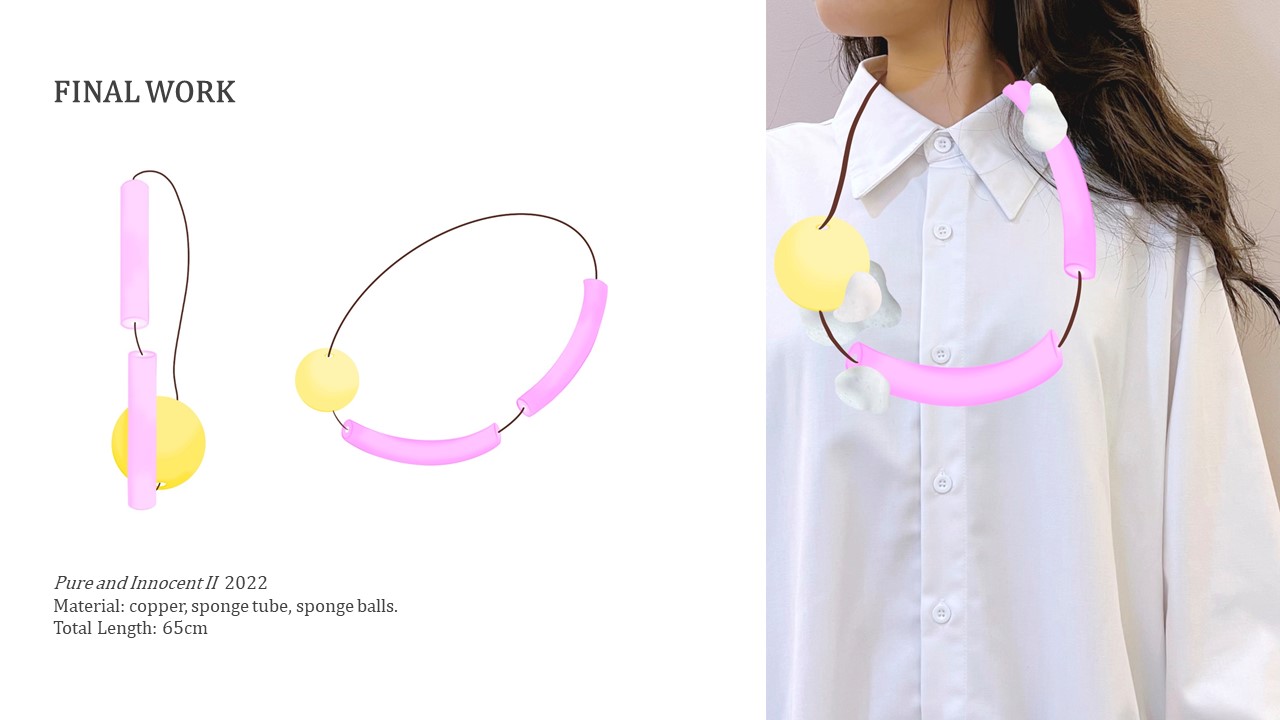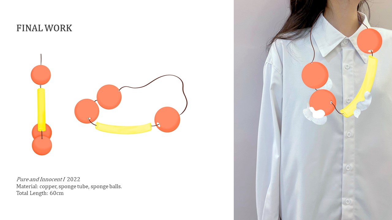 我喜歡觀察日常生活中的小事,并且每當我看到、聽到、觸摸到一件物品我都會思考它們所具有的更廣闊的意義。在我看來,首飾似乎充滿了一種神秘的能量能夠傳遞我的感受,維系我與他人之間的情感。我試圖用一些有趣的材料和現(xiàn)成物制作首飾,以展現(xiàn)日常生活奇妙的一面。 正如我的作品《純粹與天真》,清潔海綿對我來說不僅僅只是清潔的工具。他讓我想起兒時邊洗碗邊玩泡泡的情景,象征著童年的天真快樂。所以在這件作品中我把重點放在身體與海綿以及泡沫的互動上,以再造和重現(xiàn)童年稚氣的心境,也希望佩戴者能夠感受到平凡物品的美。